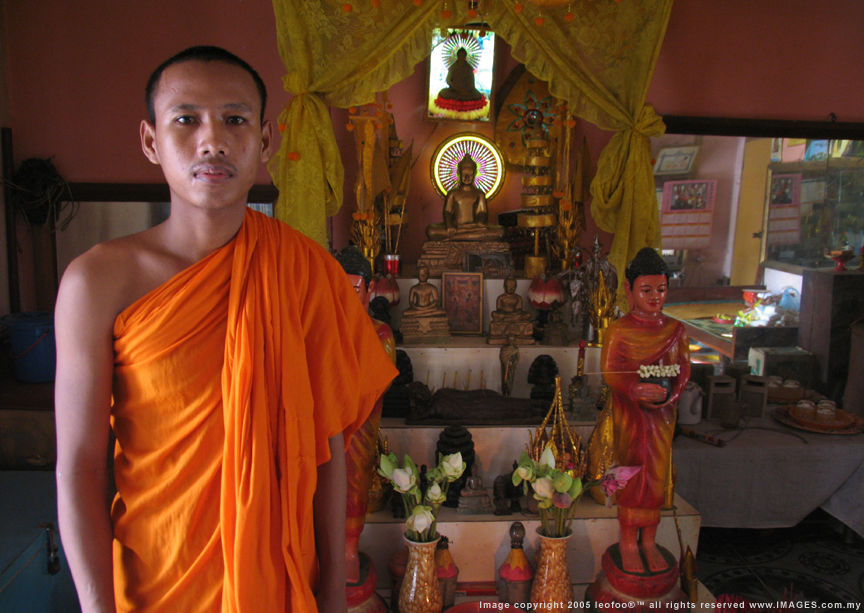 Generally, temples in Cambodian are generally named individually as "Wat" or Pagodas. They can be several structures are encompassed or when a famous figure had his ashes housed in a Stupa or Chedi, the name could override the name of the Wat by using the Pagoda. In any case, every typical temple will has a central ornate sanctuary (Thai may refer it as Viham, here it sounds like Vihara or Vihearm - for an example, the photo at the top of this page is the center stage of the Sraa Chak Pagoda). Most raw Cambodian temples for locals has a lesser influence of Indian flavor - even if they are termed as Khmer Temples. Popular statues like Naga, dvarapala, chinthe are not installed everywhere like the Angkor Wat kind of design. But one way or another, usually the entrance arc and pillars still retained the ancient feel and look. Similarly, the apparent feel of typical ancient Khmer architecture was at its entrance, although inside, the use of such design are lesser in numbers. Unlike other popular tourist Buddhist landmarks or destinations, admission into one of these local temples is free, even for foreigners. The few young monks that I met and a young, handsome man, Pheach Pheara who mixed with them was incredibly friendly. They voluntarily escort and show me around the entire premises, answered many questions and even lead to me to meet the Chief of this temple, Chean Sothy where I had my first blessing via a Cambodian way.