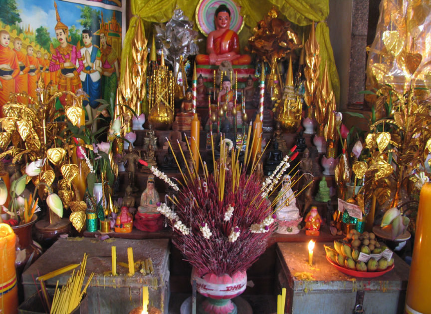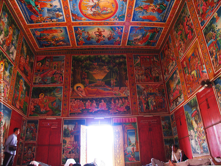 According to the chief monk, Chean Sothy, Wat (Sraa Chak Pagoda) is not as good as the 633 years old (as t 2005) Wat Phnom but it has a few hundred years old history as well. The current state of the temple was a result of a sequence of reconstruction processes, the last phase of restoration and construction of the main hall occurred 15 years ago i.e. 1990-1992. The wat is made up of several structures with the Vihearm located at the center, at the front and behind hide a Pagoda and a few Chedi of smaller scales. The left and right smaller units of residence could have been handled and operated individually by senior ranking monks and each of them also had smaller installation Buddhist images; each locations can accept or attend to public on request for blessing or other affairs Naturally, the Chao-a-Wat place of work or rest is located next to the Vihearm. The rest of other monks of junior ranking stay at the rear section where it was prohibited for entry. At the front, a few small Stupas which was decorated by a few statues depicting life and death cycles. I would think most of others could be following this model of arrangement of various structures and design. However, some well established Wat / Temples in Cambodia also operate Schools for the poor as well as permitting the homeless to temporarily seeking for shelter at day or night, the one issue is, some of them are making use of the main hall instead of the side structures - so, it may presents a little strange and uneasy feelings when you notice there are people sleeping at the center stage. I was told they are not permitted to do so, but there are some uncontrolled disciplinary issue to deal with the homeless intruders.