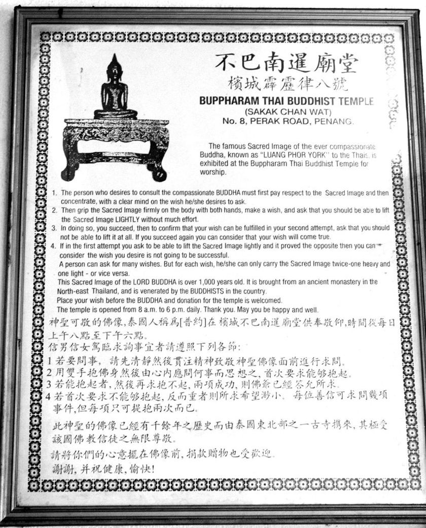 OFFICIAL GUIDE HOW TO PERFORM THE TASK (312k Gray scale Jpeg File, printed in English and Mandarin / Chinese): 1, The person who desires to consult the compassionate BUDDHA must first pay respect to the Sacred Image aid then concentrate, with a clear mind on the wish he/she desires to ask; 2. Then grip the Sacred Image firmly on the body with both hands, make a wish, and ask that you should be able to lift the sacred image LIGHTLY without much effort; 3. In doing so, if you succeed, then to confirm that your wish can be fulfilled in your second attempt. Ask that you should NOT be able to lift it at all, If you succeed again you can consider that your wish will come true. The temple is opened from 8 a.m. to 6 p.m. daily.