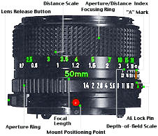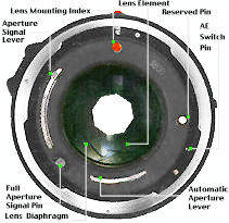 AE Lock Pin: By pressing the pin, the lens can be set at the "A" mark, or disengaged from it.