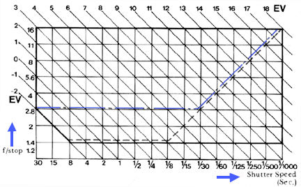 Programmed Combinations of Shutter Speed and Aperture in Programmed AE (with ASA 100 film)