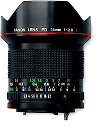 This incredible lens has the shortest focal length of any Canon Ultra-Wide Angle Lens except for the circular 7.5mm f/5.6 Fisheye lens. Yet it has a fast f/2.8 maximum aperture. * Some one mailed me and claimed this lens may also be used manually on the EOS body by way of an FD-EOS adapter but Philip Chong told me that this is not true as the adapter can only be used with New FD telephotos incorporating Rear-group focusing of 200mm and longer.