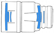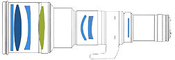Lens construction: 6 groups 7 elements (including 1 protective glass, 1 Fluorite (rendered in dark blue element and light green for UD - see illustration at left) and 1 UD glass)