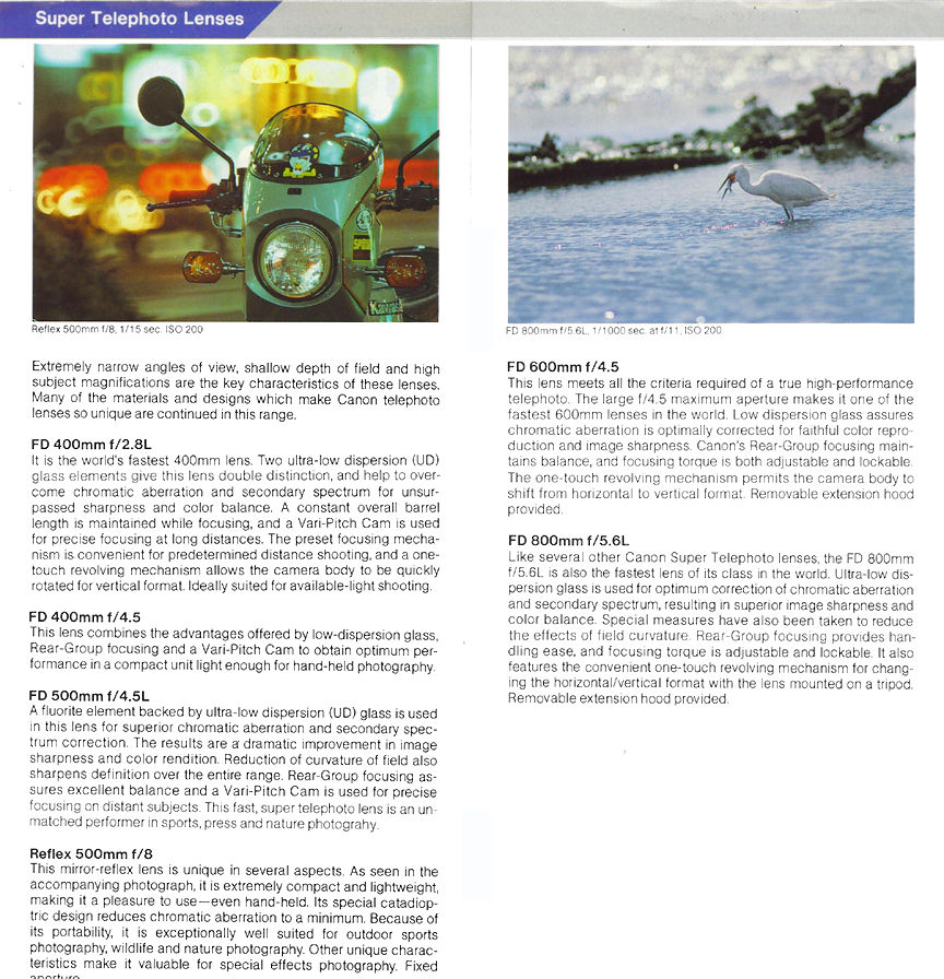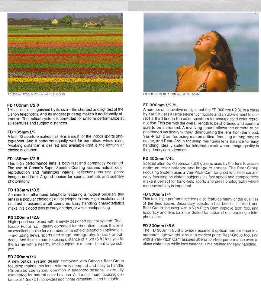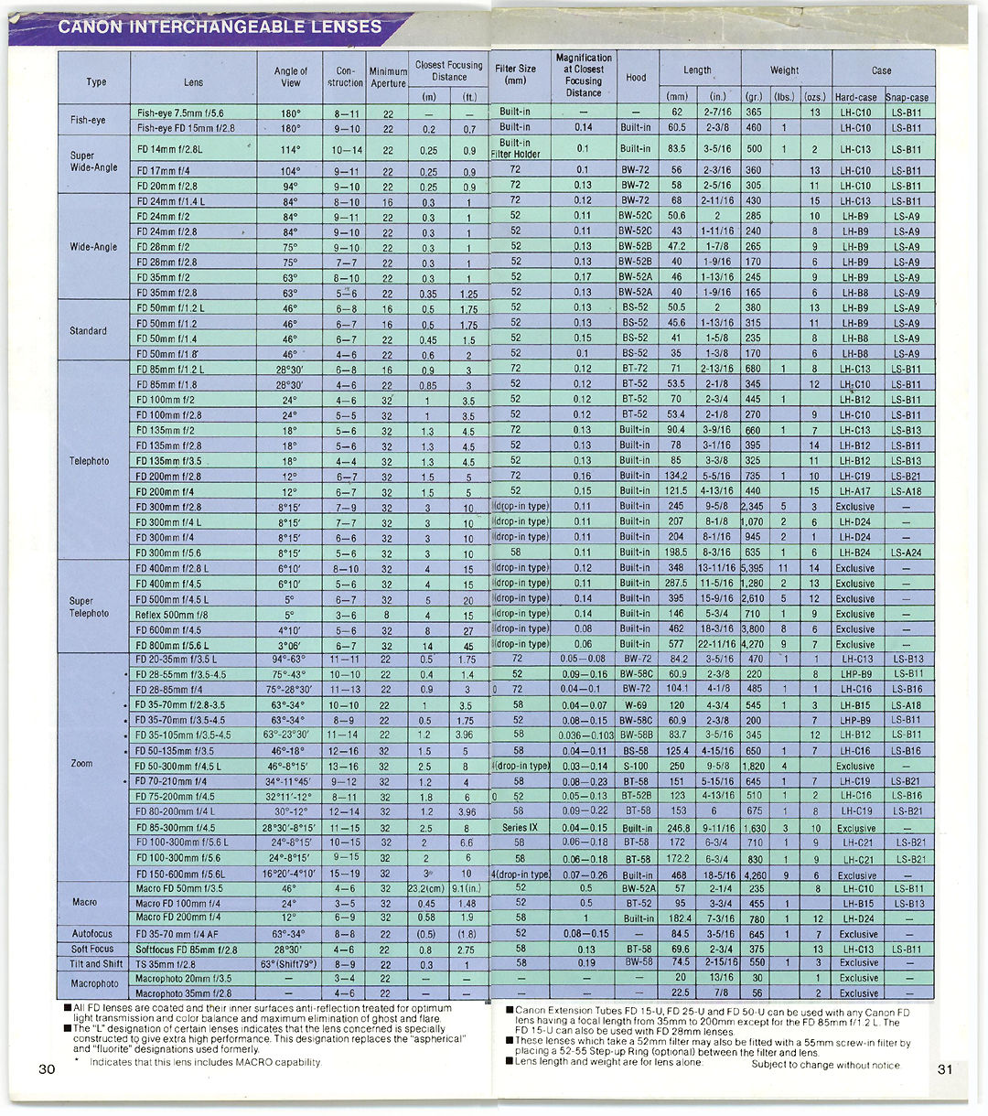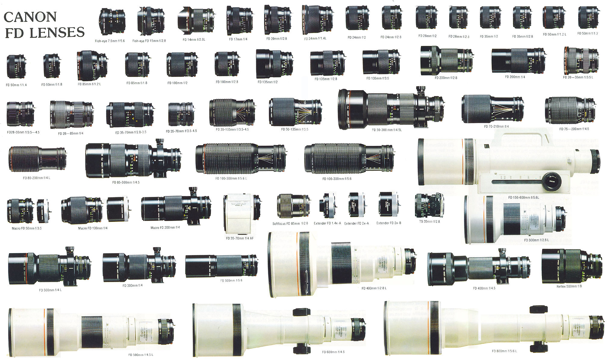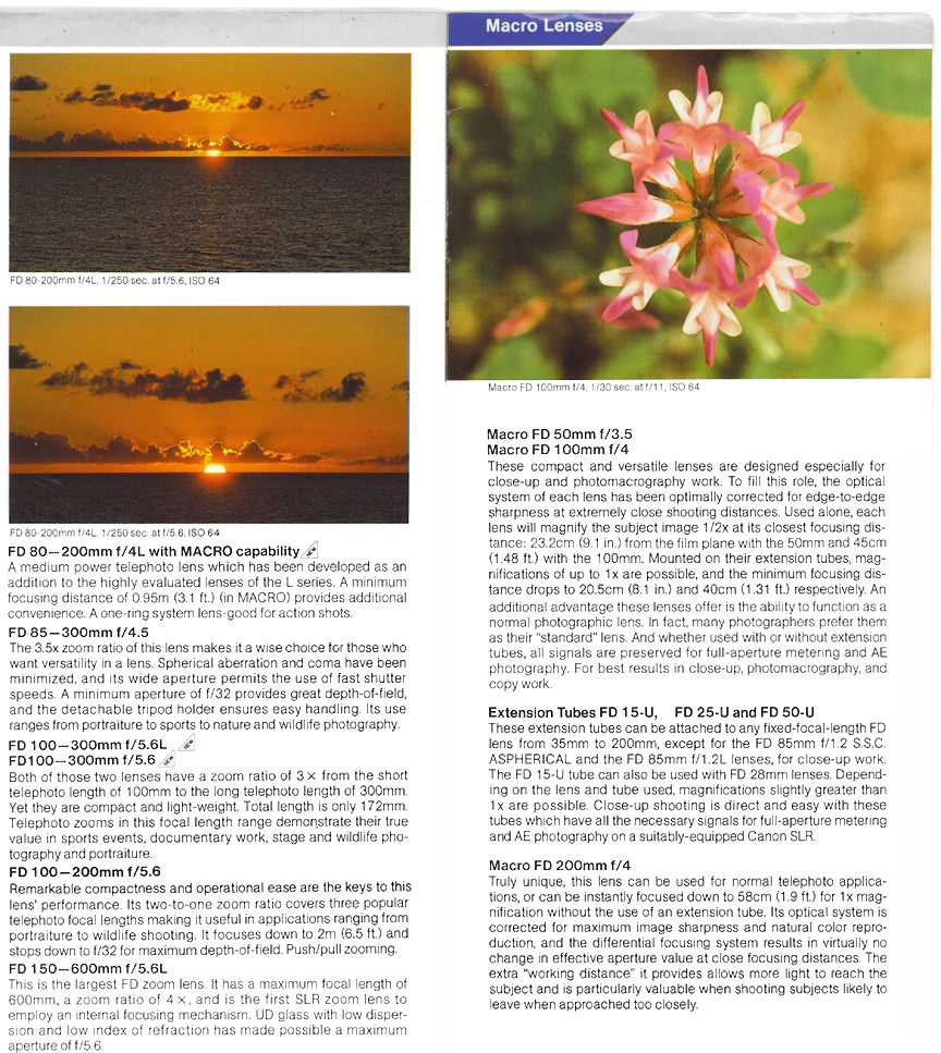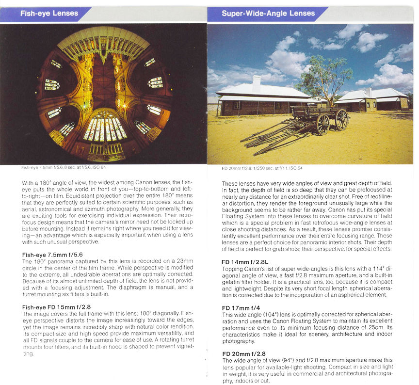 I have a canon publication #pub.c-ce-1551 1086b100 from 1981 its 31 pages with a centerfold showing 60 FD lenses and a 2page interchaangeable lense chart it's fully ilistrated showing such things as tilt and shift,soft foucus,macrophoto and an Angle of View showing Sydney Australia at 7.5mm, 15, 17, 20, 24, 28,35,50,85,100,135,200,300,400,500,600 and 800mm all taken from the same spot IF you would like a fax color copy contact me and i will send it. hi i hope this is useable im kinder knew at this and this the first time ive sent photos they should have good quality i think thanks for the info on canonfd.com got more then i expected ...- Chuck-Please note: