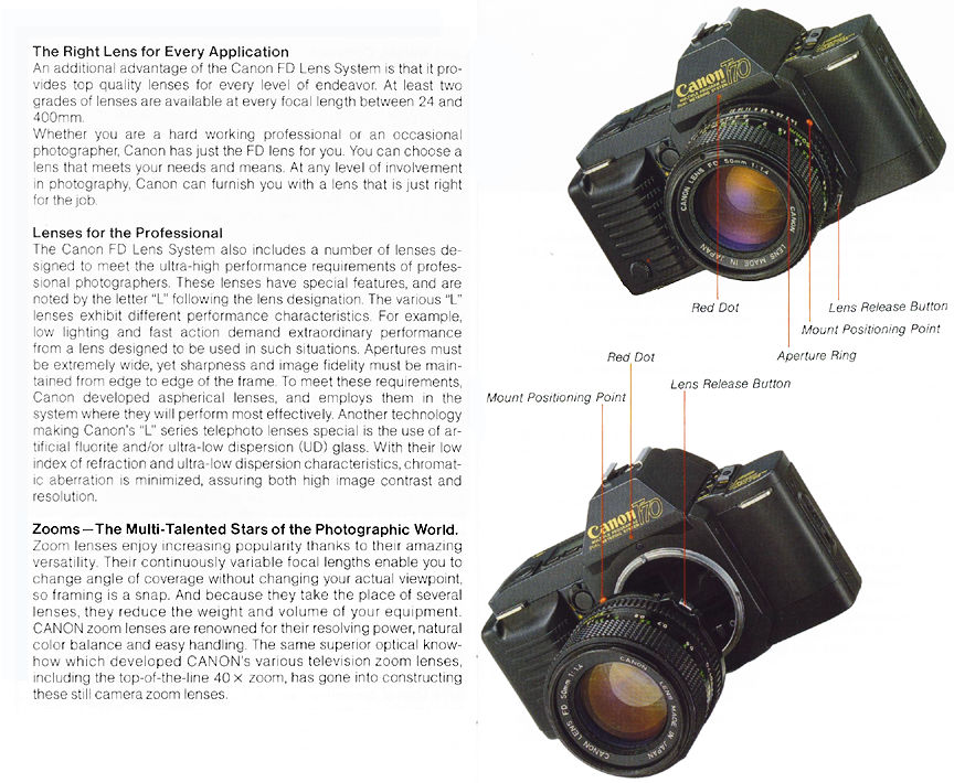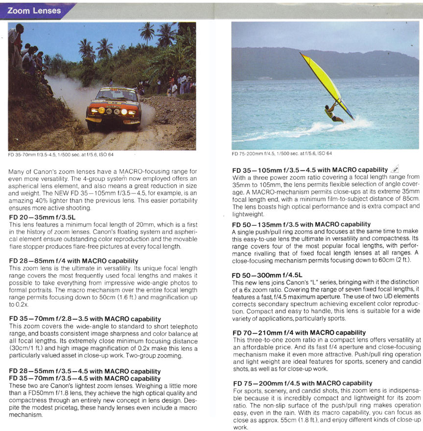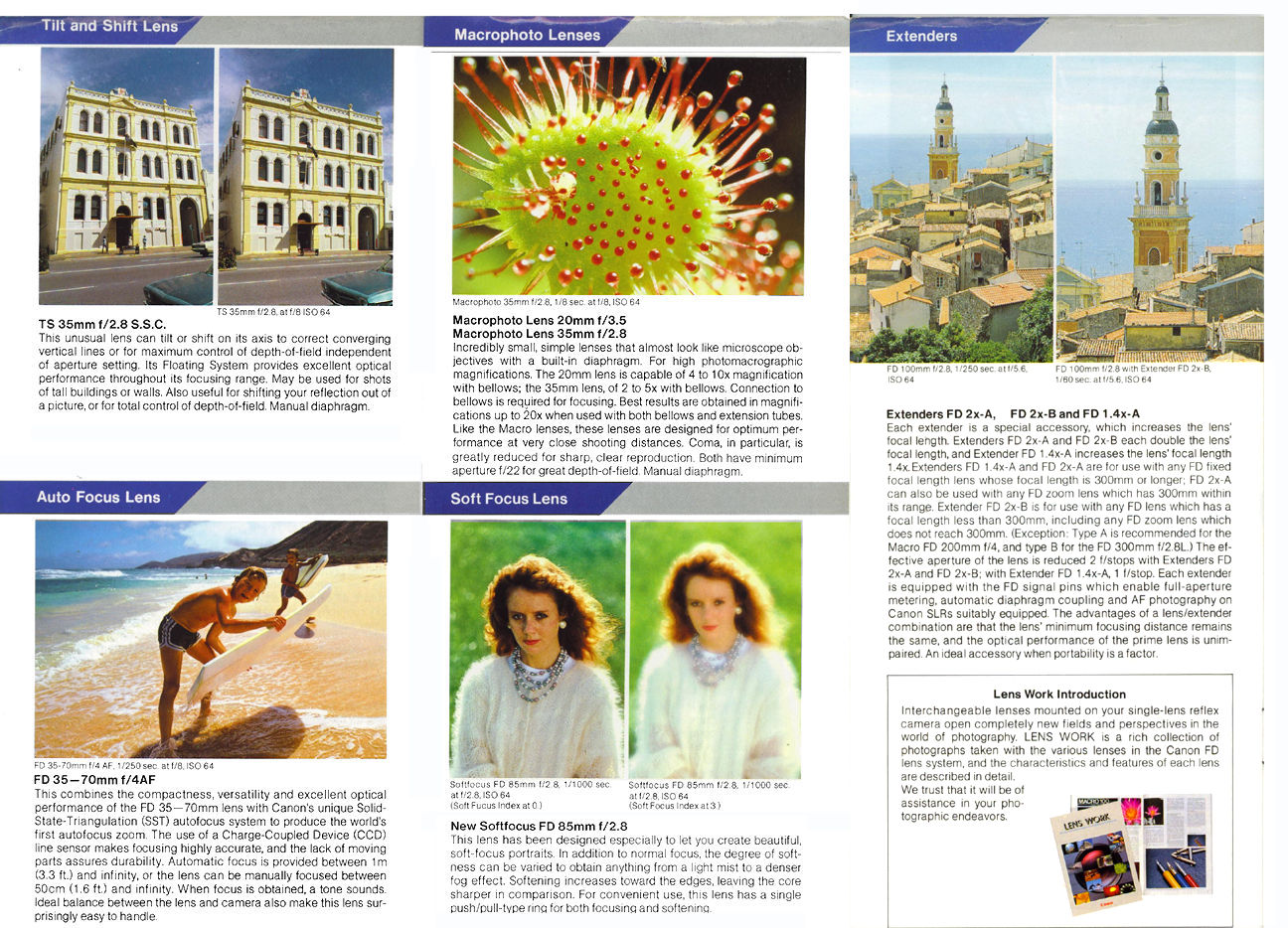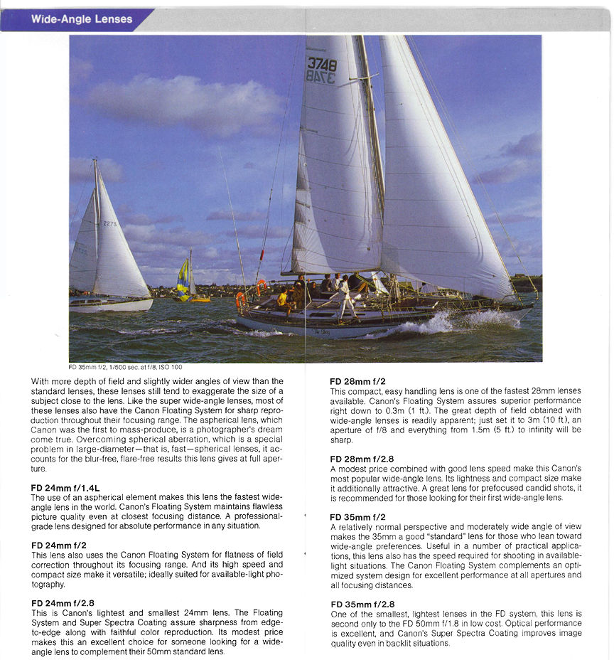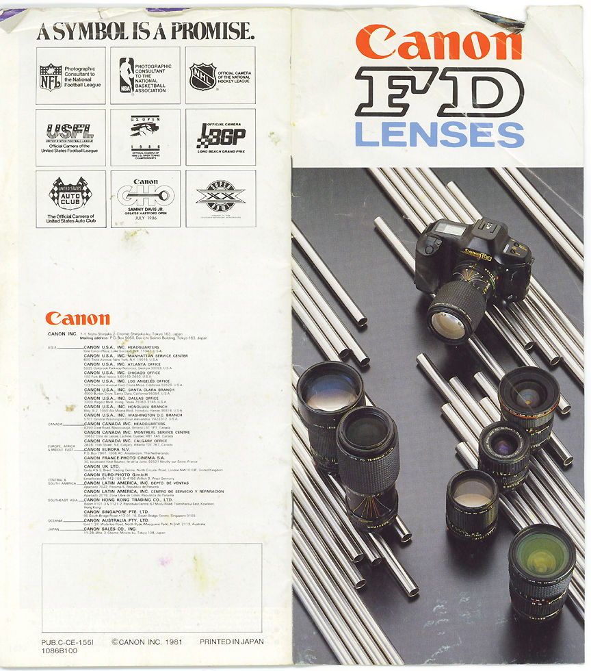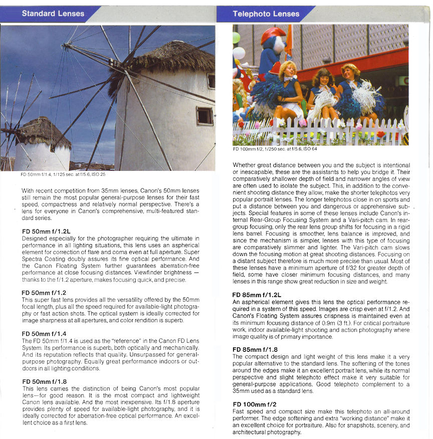 I have a canon publication #pub.c-ce-1551 1086b100 from 1981 its 31 pages with a centerfold showing 60 FD lenses and a 2page interchaangeable lense chart it's fully ilistrated showing such things as tilt and shift,soft foucus,macrophoto and an Angle of View showing Sydney Australia at 7.5mm, 15, 17, 20, 24, 28,35,50,85,100,135,200,300,400,500,600 and 800mm all taken from the same spot IF you would like a fax color copy contact me and i will send it. hi i hope this is useable im kinder knew at this and this the first time ive sent photos they should have good quality i think thanks for the info on canonfd.com got more then i expected ...- Chuck-Please note: