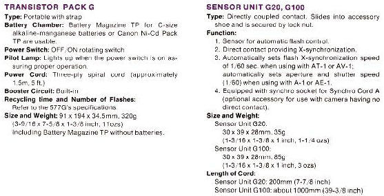 The Canon Speedlite 577G is an extremely powerful handle-mount flash unit with external power supply designed expressly for professional use. Engineered to function with Canon SLR cameras and other cameras having direct contact accessory shoes or standard PC terminals, the 577G is an advanced thyristorized system flash featuring three automatic flash ranges plus automatic bounce flash and a high Guide Number of 157 with ISO 100 film. A remote flash sensor mounts on the camera's accessory shoe to provide accurate automatic exposure control regardless of the position or bounce angle of the flash, even when it is used off-camera or aimed away from the subject, e.g.: into a flash umbrella, etc.