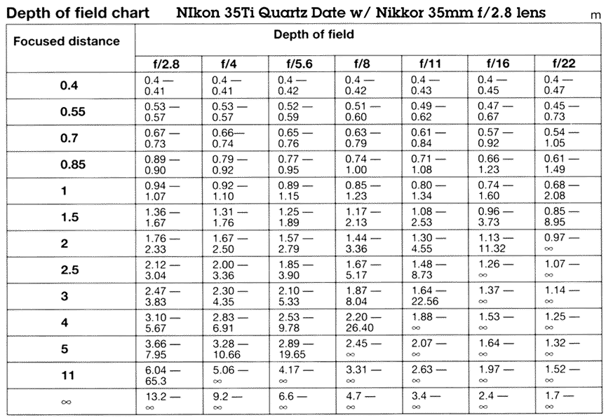 Depth of Field table for Nikon 35Ti Quartz Date model w/ Nikkor 35mm f/2.8 (Detailed View - 48k Gif)