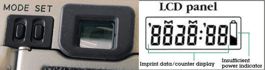 You can also activate it manually by pressing the dual functions Self-timer/Illumination button (center button on the vertical row, on top panel). This illuminates both the viewfinder, the tiny top LCD panel as well as the analogue display scales.An additional built-in highlight of both the models was the standard databack. The Quartz Date function permits imprint of data in both the standard and Panorama formats. Size and position of the imprinted on the film are automatically adjusted even if you switch to other format (normal-panorama/panorama-normal). To use the data print/off function, select the desired display by pressing the MODE button while the camera is power OFF (actually the date and time adjustment for time clock also required to turn the camera's power off first). To adjust, make use of both the MODE (for altering format variations it rotates from: (Year/Month/Day; Month/Day/Year; Day/Month/Year or Day/Hour/Minutes and a imprint-OFF selection and back to the first format selection again) and the SET button is used to confirm each selection. Unlike other data backs, this feature also lets you keep accurate track of your picture-taking. This enables you to print data on the first picture of the day, or on the first picture of every roll-so you won't mix up your photographs.
