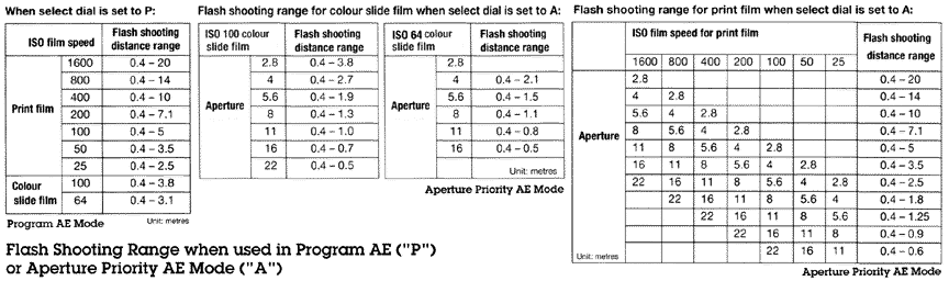 Flash shooting range Before shooting with flash, make sure the subject is within the flash shooting range for the film speed in use. The flash shooting distance varies as in the following table. Note that overexposure may occur if you take close-up pictures with film rated IS01 600 or higher. (Chart - 30k Gif)