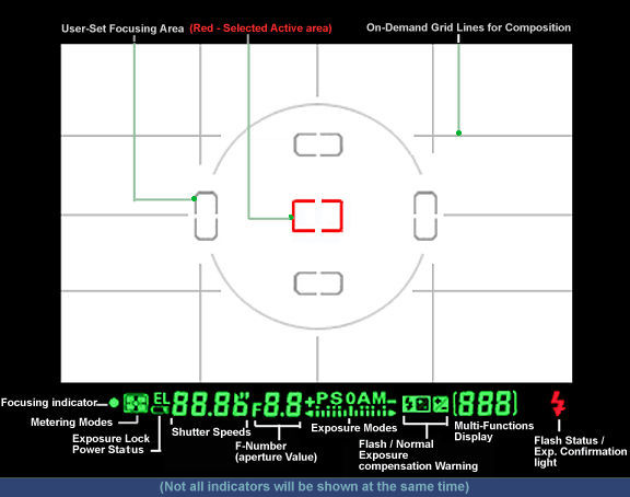 On-Screen Information Focus brackets, Grid lines, Reference circle for centre-weighted metering areaAutofocus: TTL phase detection, Nikon Multi-CAM 900 autofocus module with AF-assist illuminator (approx. 0.5m to 3m); Detection range: EV -1 to EV 19 (ISO 100 equivalent, at normal temperature: 20°C)
