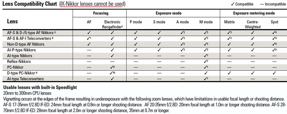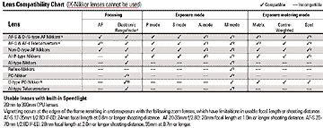* The camera is fully compatible with D / G Series Nikkor AF lenses but ignoring older lense users with similar support indirectly by not providing exposure information via the LCD even when operating in conventional CW metering.