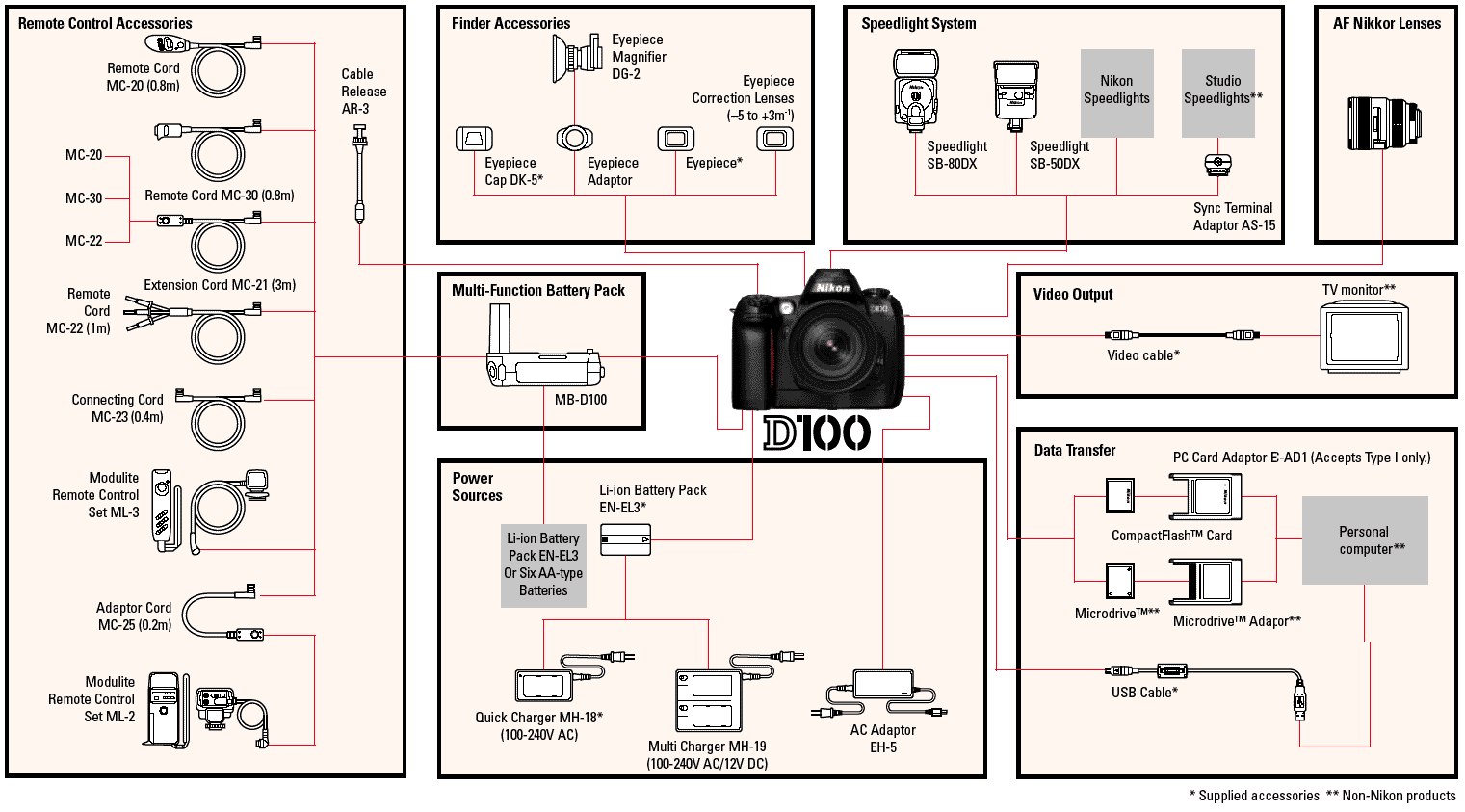 A standard package (new set) of the Nikon D100 camera should include these accessories*: * Supplied accessories may differ in each country or area.