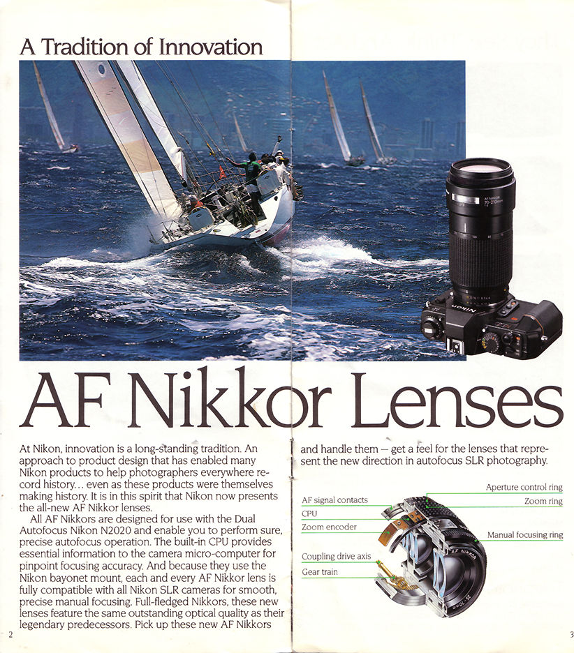 Nikkor lenses has took a full turn when the autofocus revolution that took place in the mid eighties. Despite early attempt back in 1971 with a prototype AF Nikkor 80mm f/4.5 (announced in Photo Expo, Chicago) and another good attempt of using the pro-calibre Nikon F3AF with both lens and camera AF system in 1983, Nikon has decided an architecture which primarily fall back to camera driven autofocus system. The first Nikon AF SLR which designed for mass market was a Nikon F301 (N2000) modified Nikon F501 (N2020, shown below).