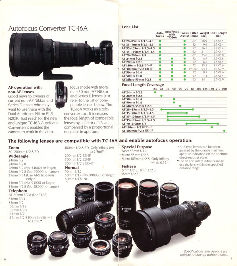 Refer to AF Nikkor Index Page for future new updates.The following lenses are compatible with TC-16A and enable autofocus operation:
