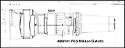 Credit: Three separate views of the lens/Focusing unit components of this Non-Ai two parts Nikkor super telephoto lense are contributed by "Igor Reznik" <igorcamera@adelphia.net> © Image Copyright 2001. All rights reserved." .... Nikkor-Q Auto 400/4.5 lens. Very early lens with serial #400737. Focusing from 16 feet. Aperture from f/4.5 to F/22. Front diameter is 122 mm. Weight is about 6.5 lb. Build in lens hood and tripod mount. Condition is Ex+/Ex++ or 8.5/9 out of 10. No dents. Clean glass. Smooth focusing. Clean aperture blades. Comes with caps and original Nikon 122 mm L39 filter. Great example of early Nikkor lens... " - Igor Reznik
