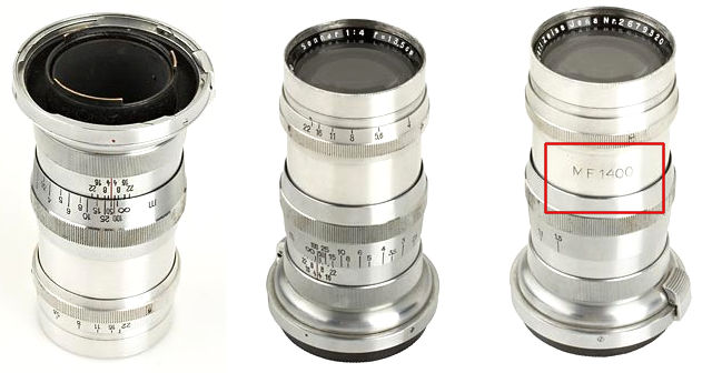 Carl Zeiss Jena Sonnar 4/13.5cm;for Contax, engraved "MF1189" for the Royal Navy. Approx. Year: 1940; another unit with "MF1400".