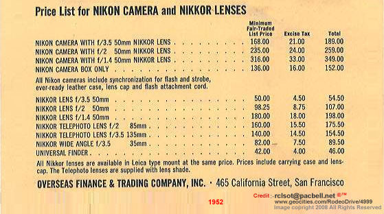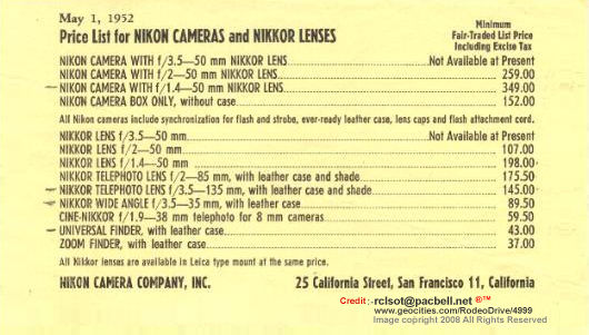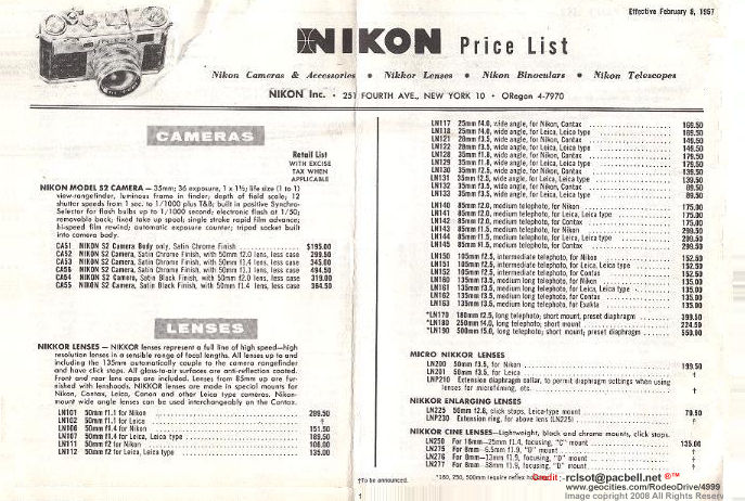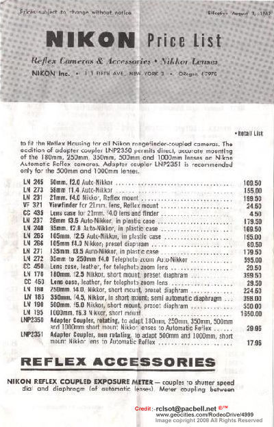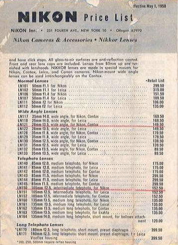 Nikon original Price Lists:- 1958 (bottom); 1959 (right);