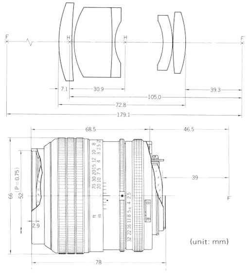 Maximum aperture: 1:2.5; Lens construction: 5 elements in 4 groups