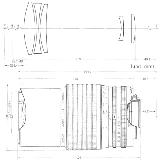 For quite sometime, since the debut of the first 200mm f/4 Nikkor telephoto lens in 1961, the lens has been remained unchange in its basic optical design in a 4 elements in 4 groups arrangement. The lens went through its first major revamp which comprised in a new design of 5 elements in 5 groups optical construction in 1975. the revised design also offered a substantially reduction in its size and weight from previous versions. An additional "negative" element has been fitted to produce a new 5 elements, 5 group configuration from the earlier 5 elements, 5 group design; the result is a 33mm reduction in the lens' overall length, with weight down by 90g from the former model.