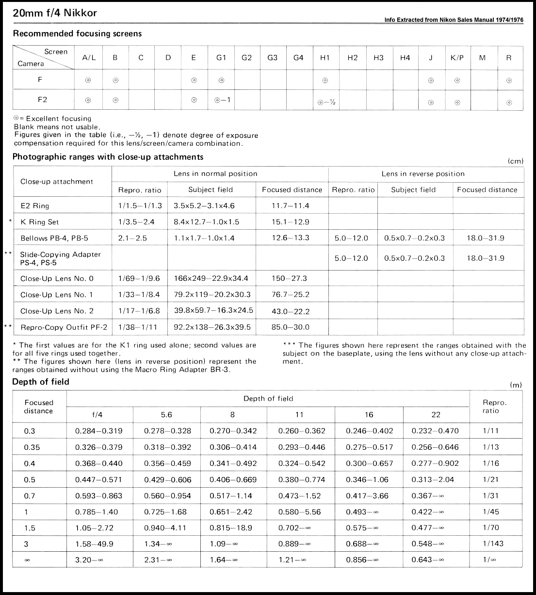 Download an Optical Construction file in new browser window: 22k Gif; Nikon guide to compatible focusing screen(s) selection, close-up attachment and Depth of Field calculation chart for this 20mm Ultra-wideangle lens. Download a file in a new browser window 104k.Gif
