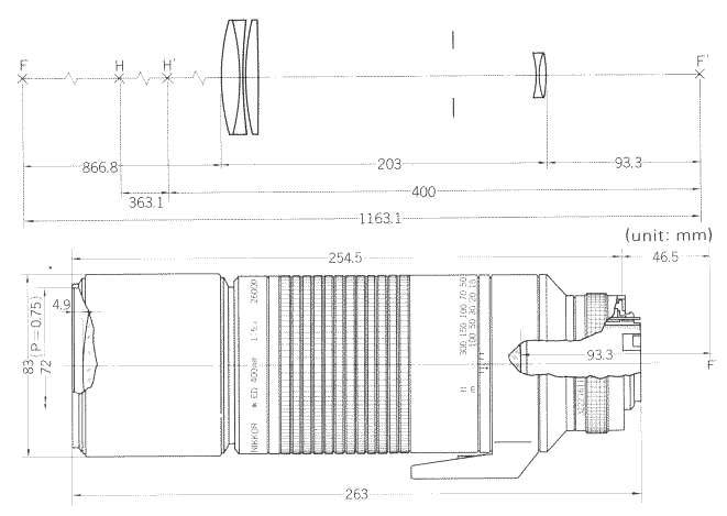 Lens Mount: Nikon bayonet mount; Dimensions: 83mm dia. x 263mm long; Weight: 1,400g