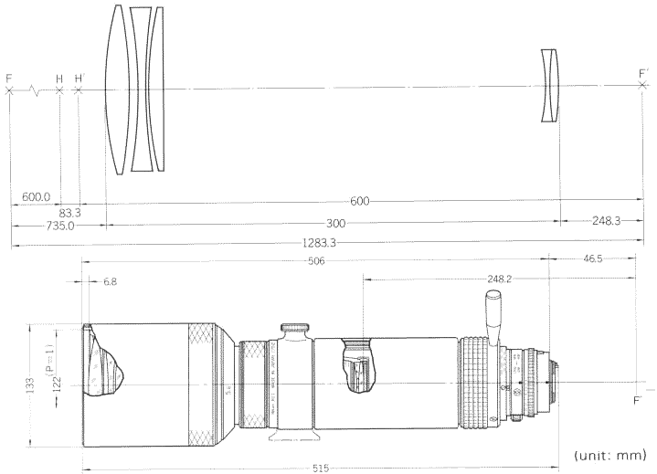 Dimensions: 133mm dia. x 312mm long (lens head only); 133mm dia. x 515mm with Focusing Unit