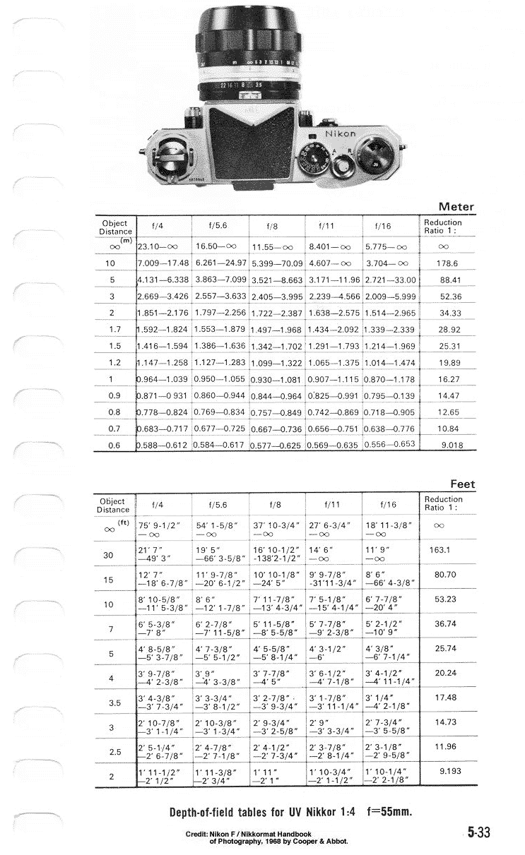 Depth of Field table for UV-Nikkor 55mm f/4.0: Click for Xplosive View (108k Gif)