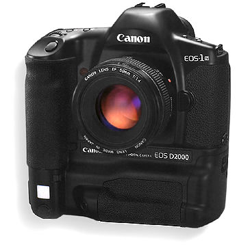 Product package: EOS D2000 camera, hand strap, neck strap, AC adapter, battery charger, universal plug, car battery adapter, IEEE1394 cable, driver soflware (for Windows/Macintosh), User's Manual