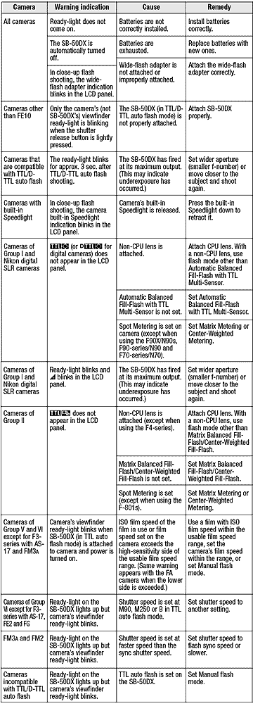 If -- blinks in place of zoom-head position indication Zoom-head cannot be set. Turn off the SB-50DX and camera, detach the SB-50DX from the camera and reattach it, then turn both units on. If operation is not resumed, contact an authorized Nikon dealer or service center.