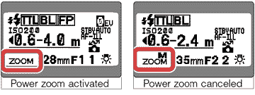 When the lens focal length is not one of those indicated above, the zoom head adjusts to the closest wideangle setting of the lens in use. For example, if the zoom setting of a CPU lens is between 36mm and 39mm, the zoom-head position is adjusted to 35mm. If a small M does not appear above the ìZOOMî indication on the LCD panel, the zoom head position will be automatically adjusted. If a small M appears, press theor