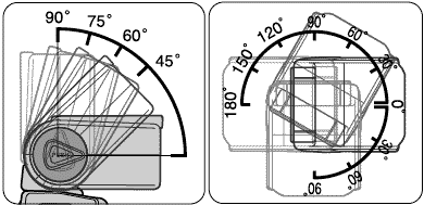 Bounce capability:- Flash head tilts down to -7°D or up to 90°D with click-stops at -7°, 0°, 45°, 60°, 75°, 90°; flash head rotates horizontally 180° to the left or 90° to the right with click-stops at 0°, 30°, 60°, 90°, 120°, 150°, 180°