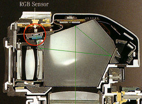 Location of the RGB sensor inside the DP-30 Multl-Meter Finder. As other finders does not have the built-in sensor, the AF sensor which doubled as the spot Meter will provide metering.