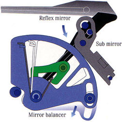 3) Mirror balancer As the name suggests, the function of mirror balance mechanism is to minimize mirror bounce, thus reducing the time required to bring the mirror down. The immediate benefit for this is results in a more smoother AF detection and also contributes to the F5's fast and accurate Focus Tracking and 8-frames per-second film advance speed.
