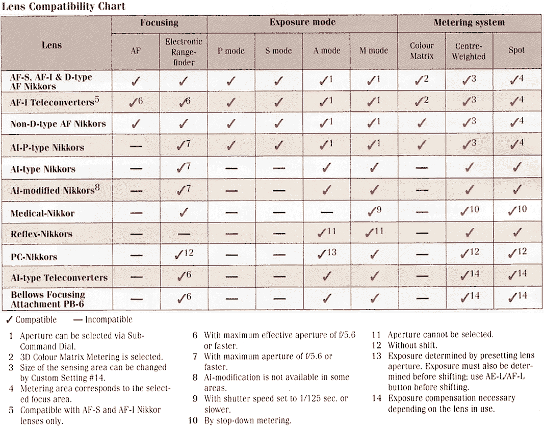 NOTE: Using older versions of Non-AI spec Nikkor lenses with the Nikon F5 (Applicable for Manual Focus, electronic rangefinder, Center-Weighted Metering), the lens mount of Nikon F5 must be modified at Nikon Service Center at an approx. cost USD80-00.