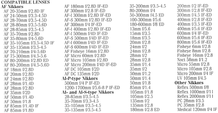 Nikon Series E Lenses: 28mm35mm50mm100mm135mm | E-Series Zoom lenses: 36~72mm75~150mm70~210mm