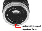 This is the conventional coupling lever for stopped down metering which automatically resets the full aperture opening position after shutter release. This lever also couples with the stopped-down functioning and self-timer lever on the camera body. Stopped down metering can be performed after turning the stopped-down functioning lever.