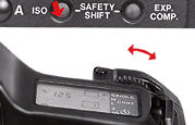 a) While pressing the film speed button, turn the electronic input dial until the film speed (indicated by ISO) of your film appears on the display panel. (ISO 6 - 6400)