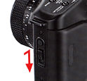 1) To open the back cover, push the back cover latch down while pressing the back cover lock button. 2) Insert the upper flat end of the film cartridge into the film chamber first, then lower the other end. The film-load check mark (@) will then appear on the display to indicate that film is loaded.