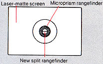 This breaks the subject into tiny fragments, causing a shimmering effect when out of focus. The subject is in focus when the image in the microprism ring is clear and not shimmering.Laser-matte screen