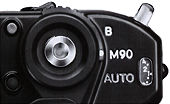b: Shutter Operation Mode Selection The shutter operation mode selector has two mechanical override settings. M90 provides a shutter speed of 1/90 sec., it is also used for flash photography with an electronic flash unit other than the Nikon SB-E or SB-10 (p. 28). B is for long exposures—the shutter curtains remain open for as long as the shutter release button is kept depressed. A tripod is essential for B exposures.