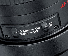 The AF/MF switch is well designed and rigidly built. The focusing range can be easily switched between 0.48m to OO and 1.5m to OO for more responsive activation for autofocusing.