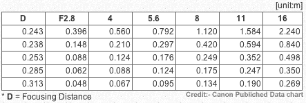 Credit: Image courtesy of Mr. Mike Niemi®, US. Mike Portfolio can be accessed via Pbase Link . Image copyright © 2006. All rights reserved. Please respect the visual property of the contributing photographer.For the die hard who wishes to go beyond the extreme, theoretically, you can mount the Extender EF for even 1X from the maximum R. Ratio given but Canon advises against the usage in this manner. Well, the already dim finder at higher magnification will be even dimmer, optical quality may deteriorate, further and lastly - refer to the depth of filed chart below (in mm) with such available extremely shallow zone of sharpness, what can you possibly find something interesting to shoot ? haha ..you can try for fun of it but with a price tag of a suggested list price at USD1,390-00 and used price approx. at USD830~USD900-00 lens only (Extender not included), it can be an expensive trial out.