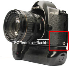 The PC terminal Please referred back to PC terminal section. This is an optional flash connection terminal for flash photography. Note: when use with this connection method, even if you are using a dedicated Canon flash, ONLY auto or manual flash control is possible i.e. non-TTL flash photography.| Previous | Main Index Page | Next -->>> Next section covers palm door for other extension of functions, Remote control socket, inside the camera after film back is opened, film transport in brief, Film winding and remove film during Mid-Roll etc.
