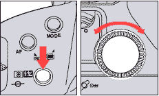 For a quick guide & illustrations how it works:- 1. While pressing the AF mode selector, 2. turn the main dial to the left or right until the desired AF mode appears in the LCD panel. Release the AF mode selector NOTE:- Acts as a visual reminder, these two (AF & Shot mode) buttons have interlocking signs to the Meter Mode cum Flash exposure compensation button (see next) that they have other related functions to be extended in camera functionalities.