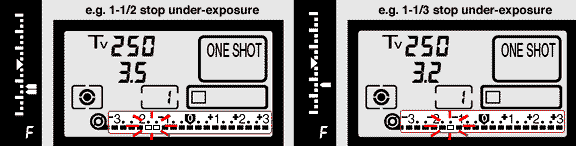 If CF No. 6 is used to set the exposure compensation amount in 1/2-stop or 1/3-stop increments, the exposure level indicator in the viewfinder display and in the LCD panel appear as shown here.Flash exposure compensation is different from ambient light exposure compensation. It is grouped under Flash Photography section.