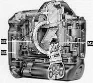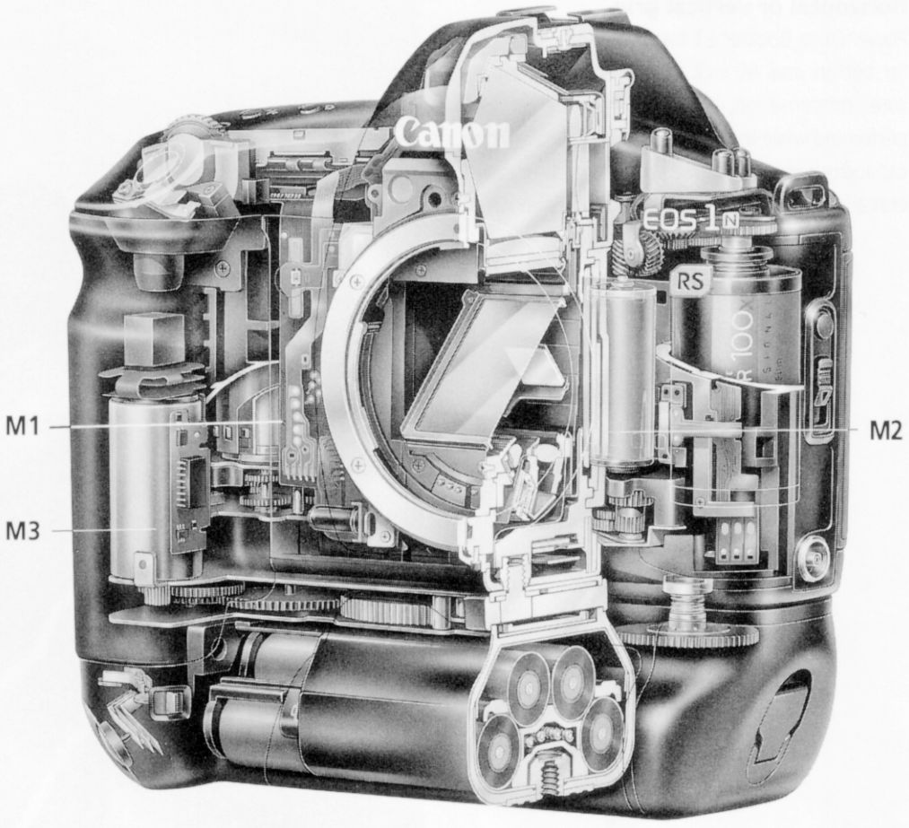 Motors Locations (160k)(4) Film Stop Position Control As mentioned earlier, the Canon EOS-1N achieves a continuous shooting speed of 6 fps by increasing the gear ratio of the film transport system. To prevent the reduction in film control performance that such an increase in winding speed would introduce, the following modifications were implemented to maintain film transport control performance on a par with the EOS-1