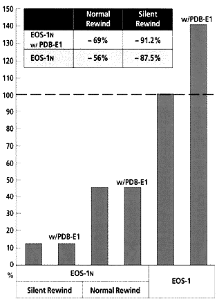 Table below shows a comparison of rewinding noise levels between various camera models and configurations, with the noise level of the EOS-1 set equal to 100. As can be seen, the above modifications to the rewinding system reduce the noise level to approximately 1/8 the level of the EOS-1, expanding the range of shooting situations in which the camera can be used without fear of disruption caused by loud rewinding noise.