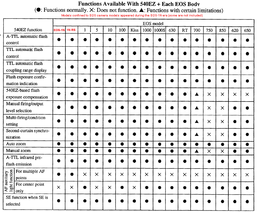 When attached to the T80 and previous cameras which are not equipped with a TTL automatic flash control function, the 540EZ fires at fill power because the camera does not send a stop signal to the flash unit. Manually set the aperture according to the value calculated from the "Guide number divided by Shooting distance" formula. In manual firing mode, the 540EZ operates at the output level indicated in the display.For Canon 540EZ when uses EOS cameras other than the EOS-1N, CLICK HERE for the compatibility Chart (models confined to to EOS-1n Era).