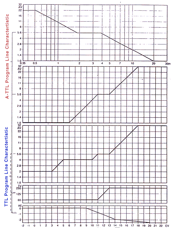 A-TTL & normal TTL Program line characteristics --->>> 48K GifIn previous EOS-1 models, the compensation amount was fixed at -1.5 stops at all brightness levels greater than EV 13 (at ISO 100). In the EOS-IN, however, the compensation amount drops to -2 stops at EV 14 and continues to drop at a gradual slope as the brightness level increases.