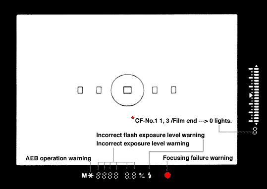 (3) Performing exposure compensation by changing the ISO film speed affects both the ambient light exposure level and the TTL automatic flash exposure level.Viewfinder Exposure Warnings in A-TTL and TTL Automatic Flash Exposure Modes (Using 50mm f/1.4 lense)